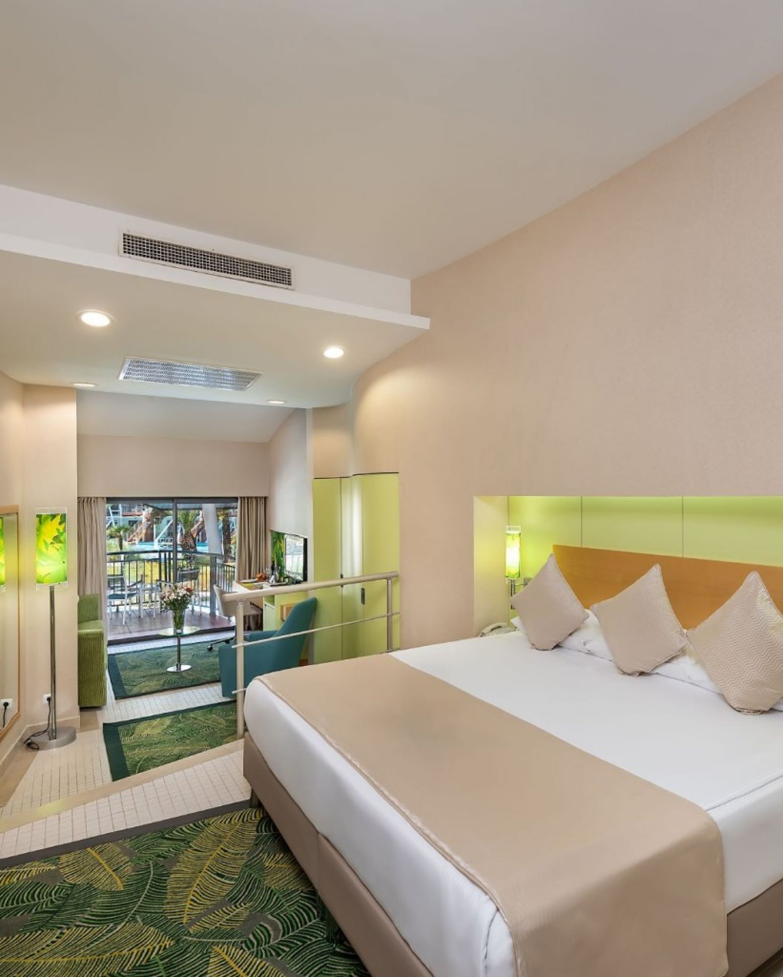 В стаите: Състои се от основна 5-етажна основна сграда Hotel (70% от стаите са с гредка море), 3-етажна сграда Villa Standard Garden Room с гледка към градината и стаи от категория Villa Junior Suit. Хотелът разполага с общо 358 стаи, които са оборудвани с централен климатик, телевизор, телефон, баня с вана или душ, халат и чехли, сет за кафе и чай, кошница с плодове: в деня на пристигане (и вино), сешоар, сейф 9безплатне), мини-бар безплатно (безалкохолни напитки и бира - ежедневно зареждане), Wi-Fi (безплатно), room service: платено (за обслужване; безплатно за Villa Junior Suite Deluxe Suite Grand Deluxe Suite от 22:00 до 07:00-плаща се поръчката; алкохолни напитки – 24 часа, платено), под - мокет (мокет (Villa Garden – ламинат или мокет, Villa Junior Suite – теракот). Почистване на стаите - ежедневно, смяна на спално бельо - 3 пъти седмично.