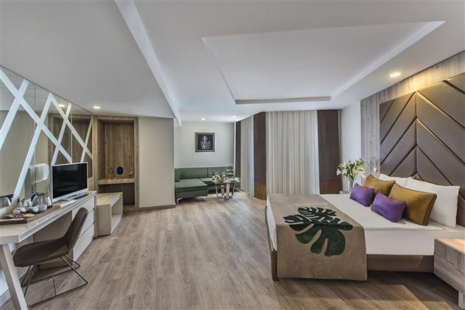 Стая 42 кв.м с балкон и изглед към сушата, частичен или пълен морски изглед, с двойно и единично легло, диван, подходяща за 3+1 или 2+2 души, с баня, климатик, минибар, сейф, LCD телевизор, безплатен Wi-Fi, и всички стандартни удобства, включително ежедневно почистване и възможност за бебешка кошара.