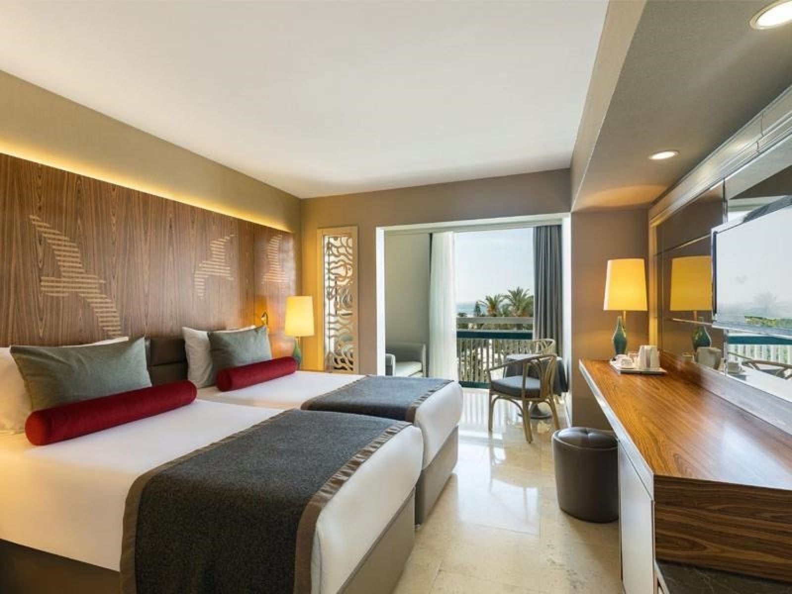 В стаите: Хотелът разполага с общо 352 стаи - 82 Standard Balcony Sea View (24 м2), 82 Standard Balcony Land View (24 м2), 104 Standard French Balcony Sea View (30 м2), 104 Standard French Balcony Land View (30 м2), 140 Larger Standard (35м2), 24 Suite (60м2), 2 Honeymoon Suite (50м2).