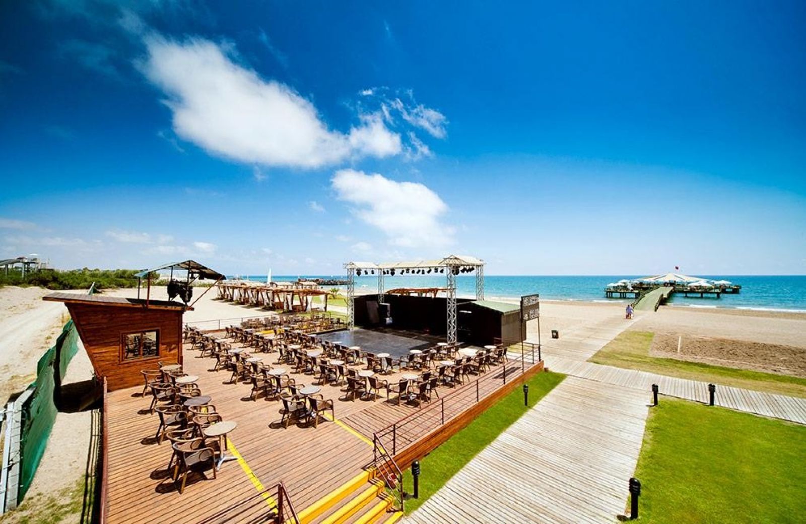Плаж: *Гостите на хотела използват плажа на SUENO DELUXE BELEK. Собственият пясъчен плаж е на 400 м с осигурен безплатен шатъл в определени часове. Дължината на плажа е 220 м., пирс - 1 800 м. Шезлонги, чадъри, матраци, плажни кърпи - безплатно. Душ, съблекални. Павилиони на плажа, кея и край басейна (срещу заплащане).