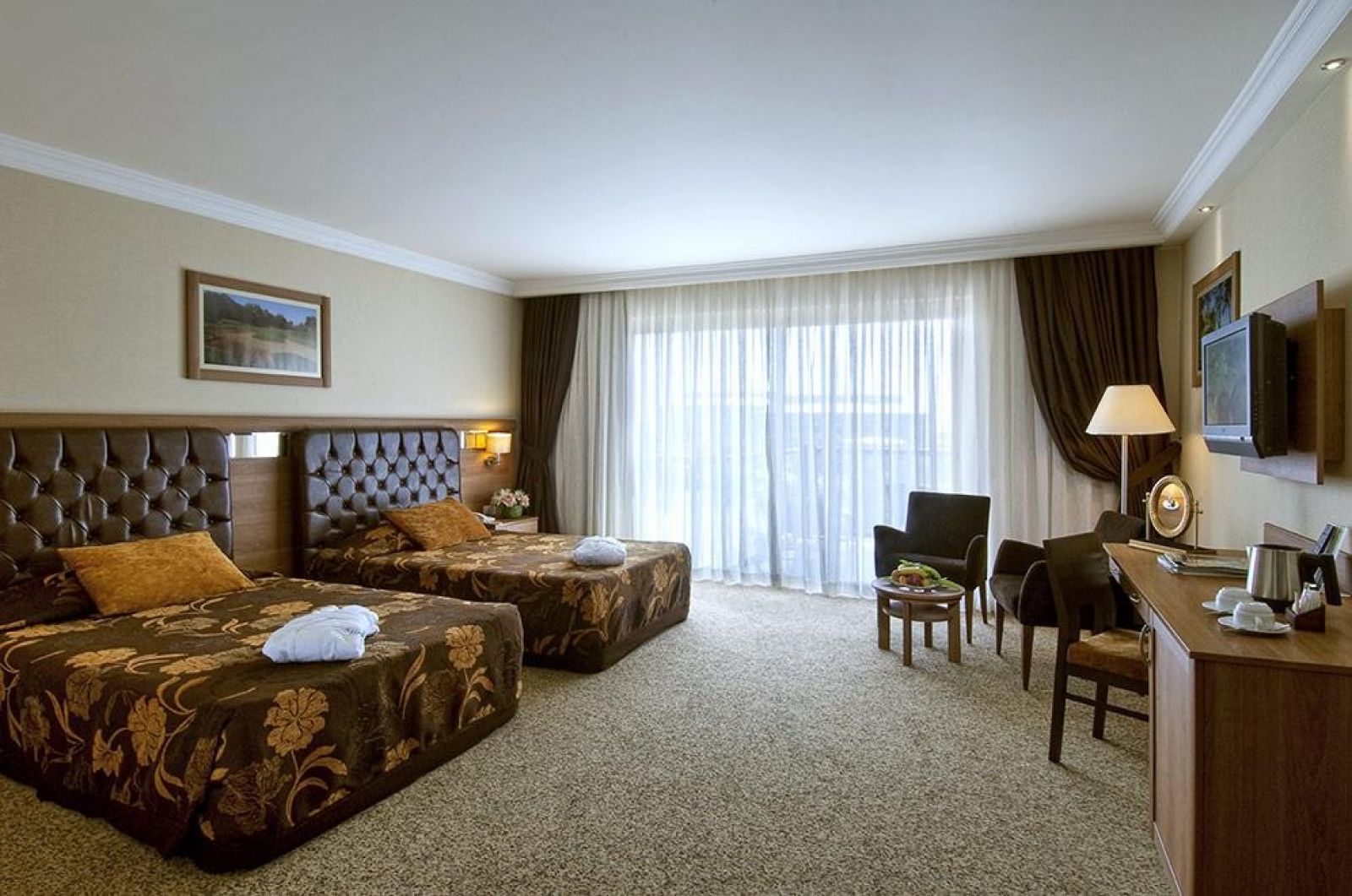 В стаите: Състои се от основна 6-етажна сграда с 2 асансьора и разполага със 174 стаи (50% от тях имат изглед към голф игрището). Стаите са оборудвани с централен климатик (в зависимост от метеорологичните условия), минибар (вода, безалкохолни напитки и бира - попълване ежедневно), плазмен телевизор (2 руски канала), музикални канали, телефон с директно избиране, халат и чехли, Wi-Fi (безплатно) , сет за кафе и чай, баня, сешоар, балкон, сейф (безплатно), меню за възглавници, под - килим. Почистване на стаите - ежедневно, смяна на спално бельо - 3 пъти седмично.