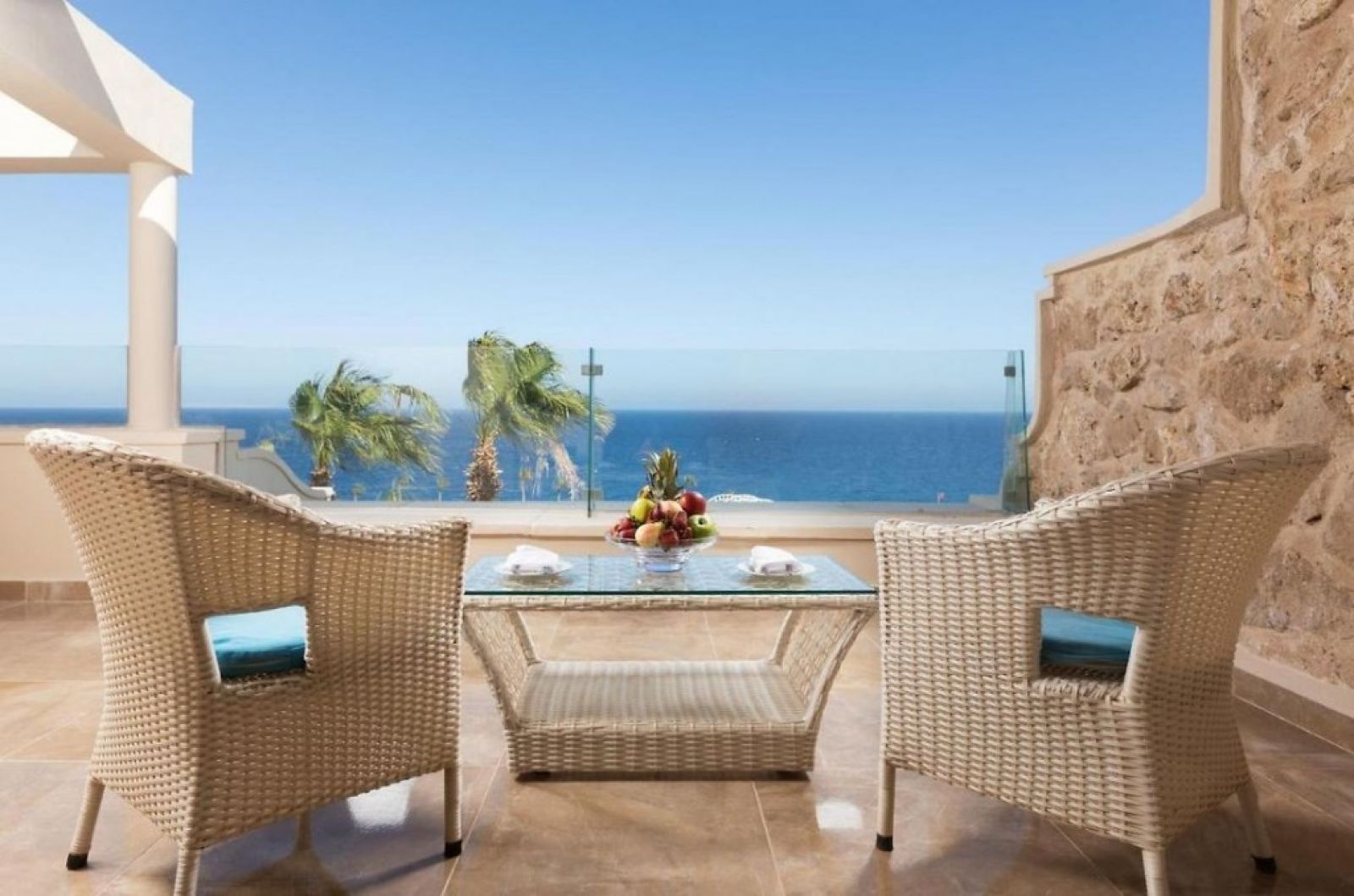 В стаите: Хотелът разполага с общо 550 стаи, разположени в 1 основна четириетажна сграда, и комплекс от дву- и четириетажни корпуси: Standart rooms (с изглед към морето – 57-64 м2), Deluxe rooms (с изглед към морето – 70 м2), Family rooms (2 спални, с изглед към морето 70 м2). Всички стаи са оборудвани с климатик, телевизор, телефон, баня с душ, сешоар, сет за чай/кафе, минибар (зарежда се с вода и безалкохолни напитки - безплатно), сейф, балкон, Wi-fi. Почистване на стаите и смяна на кърпи - всеки ден, смяна на спално бельо - 2 пъти седмично.