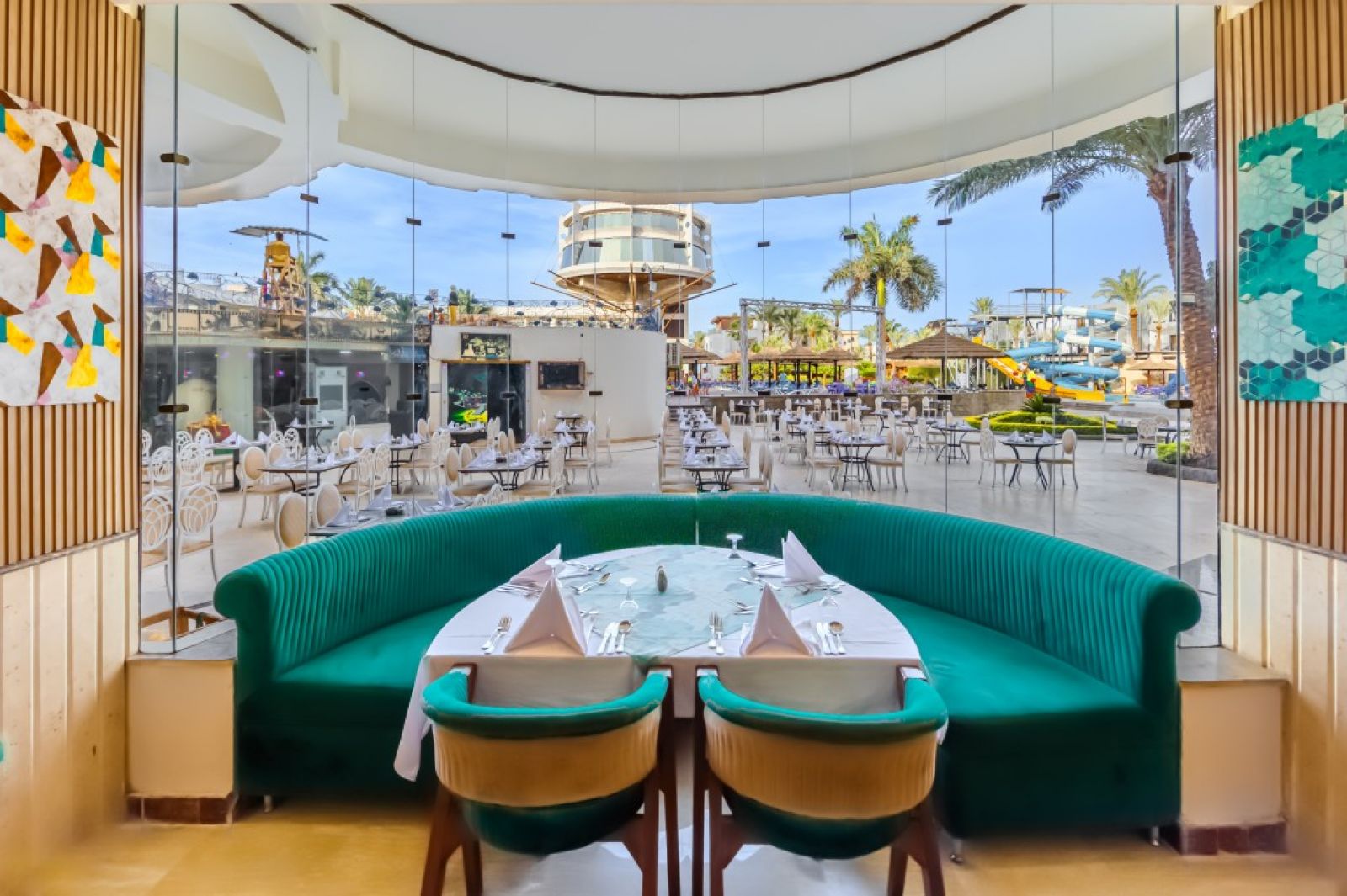 На територията на хотела: 2 основни ресторанта, 2 а ла карта, 4 бара, 5 басейнa (2 отопляеми през зимата), аквапарк (8 водни пързалки за деца и 3 за възрастни), дискотека (безплатно, напитки - платено), Wi-Fi във фоайето, платено.