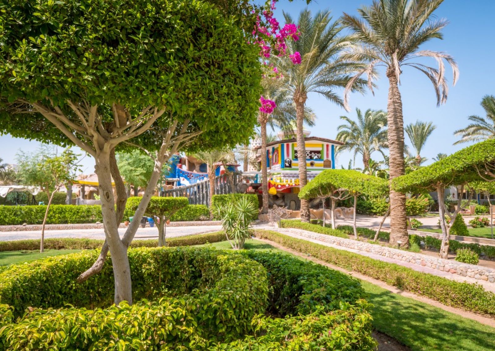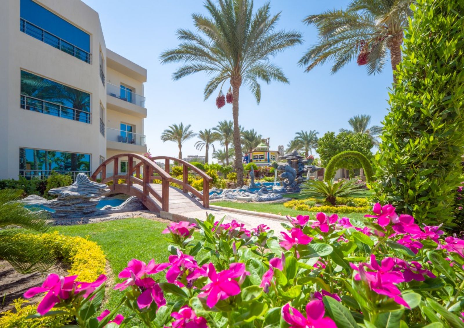 Разположение: Хотелът се намира в центъра на града. Наблизо има много ресторанти, барове и магазини. Има собствени водни пързалки. Препоръчваме го за младежки и семейни почивки с деца. Разположен e в самия център на Хургада и 10 км. от летището, на брега на морето. Състои се от комплекс от 3-, 4- и 5-етажни сгради. Обща площ: 71 875 м2.