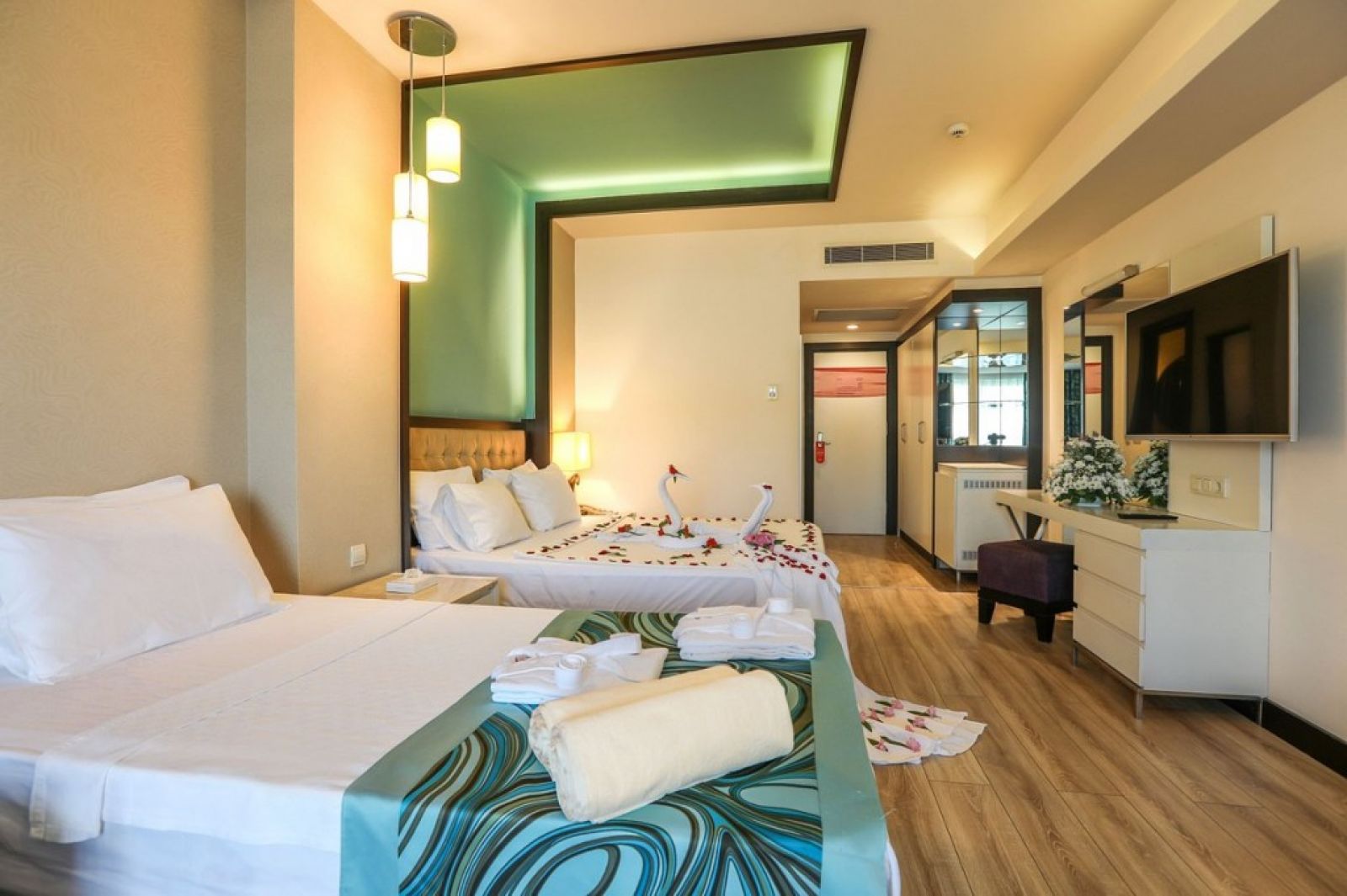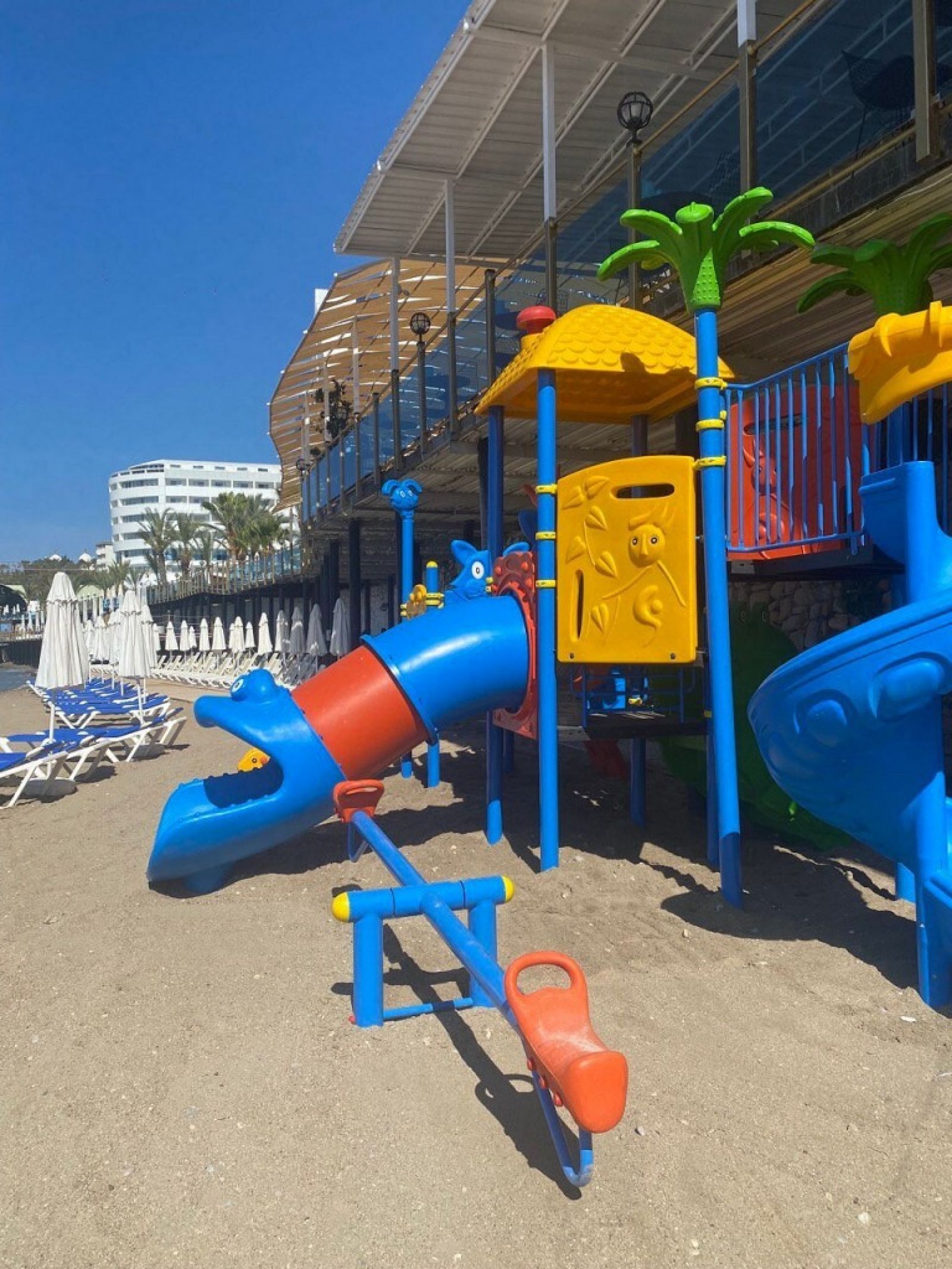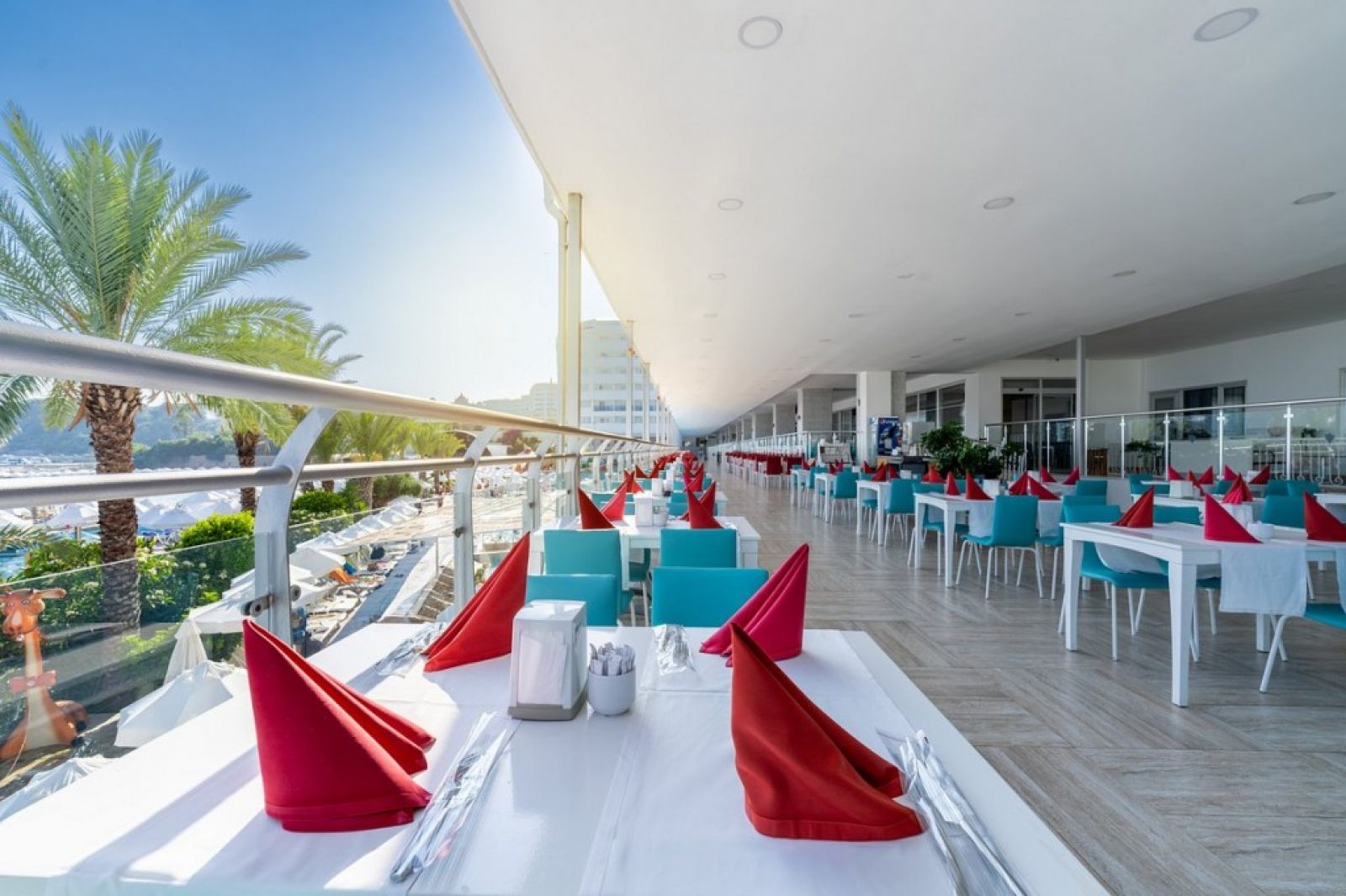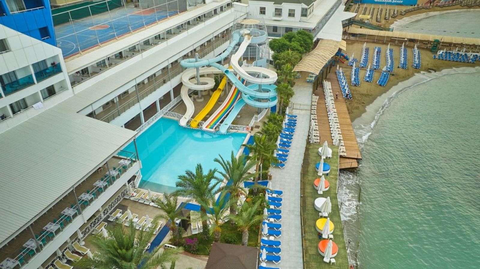 Благодарение на структурата си, построена на брега на Средиземно море, първото нещо, което ще привлече вниманието ви, когато влезете в хотела, ще бъде синьото, простиращо се докъдето поглед стига. Можете да се насладите на дневни и нощни забавления на нашия кей или да се насладите на спокойствието на нашия частен пясъчен плаж. Освен това, нашите малки гости могат да се забавляват в детския басейн, водните пързалки и мини клуба през целия ден.