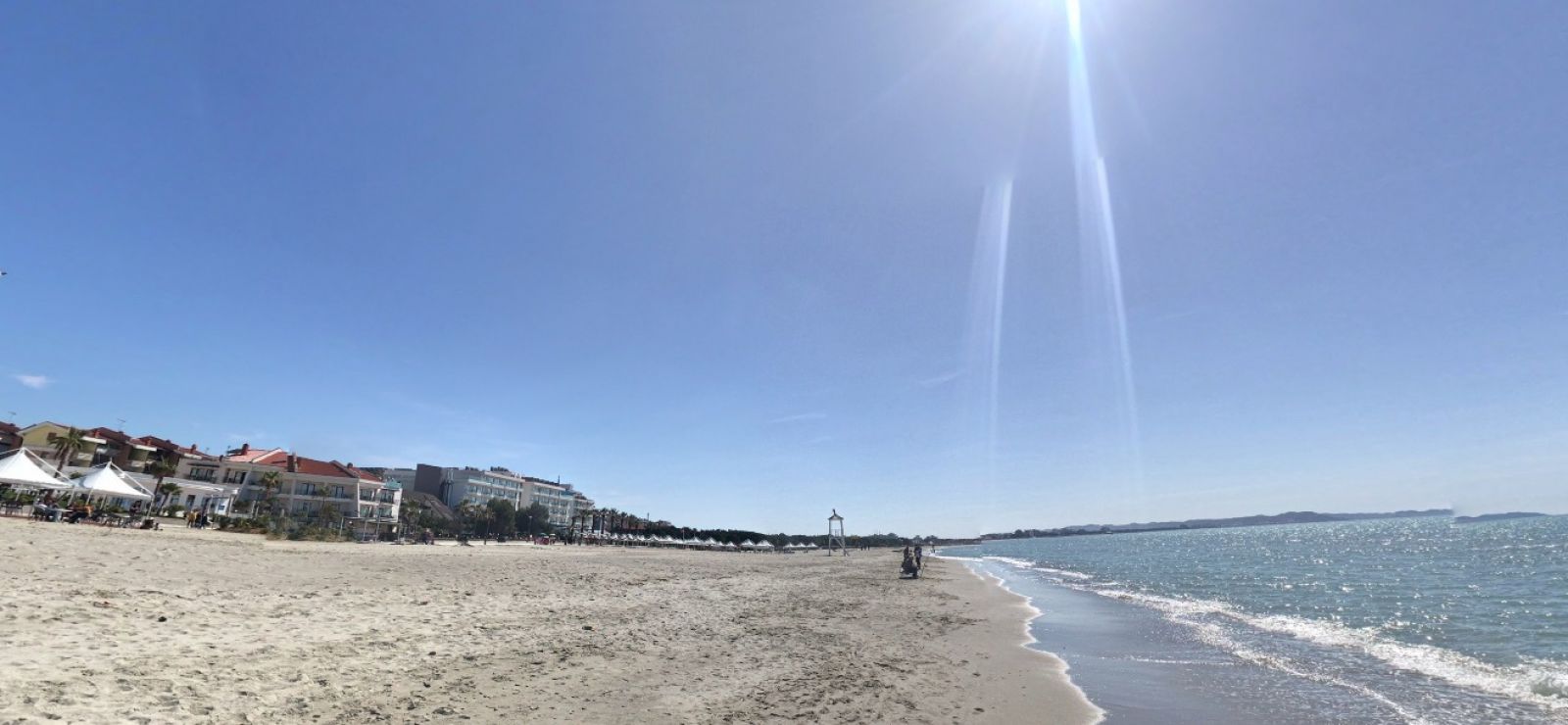 Градски пясъчен плаж. Чадъри и шезлонги на плажа - срещу заплащане.