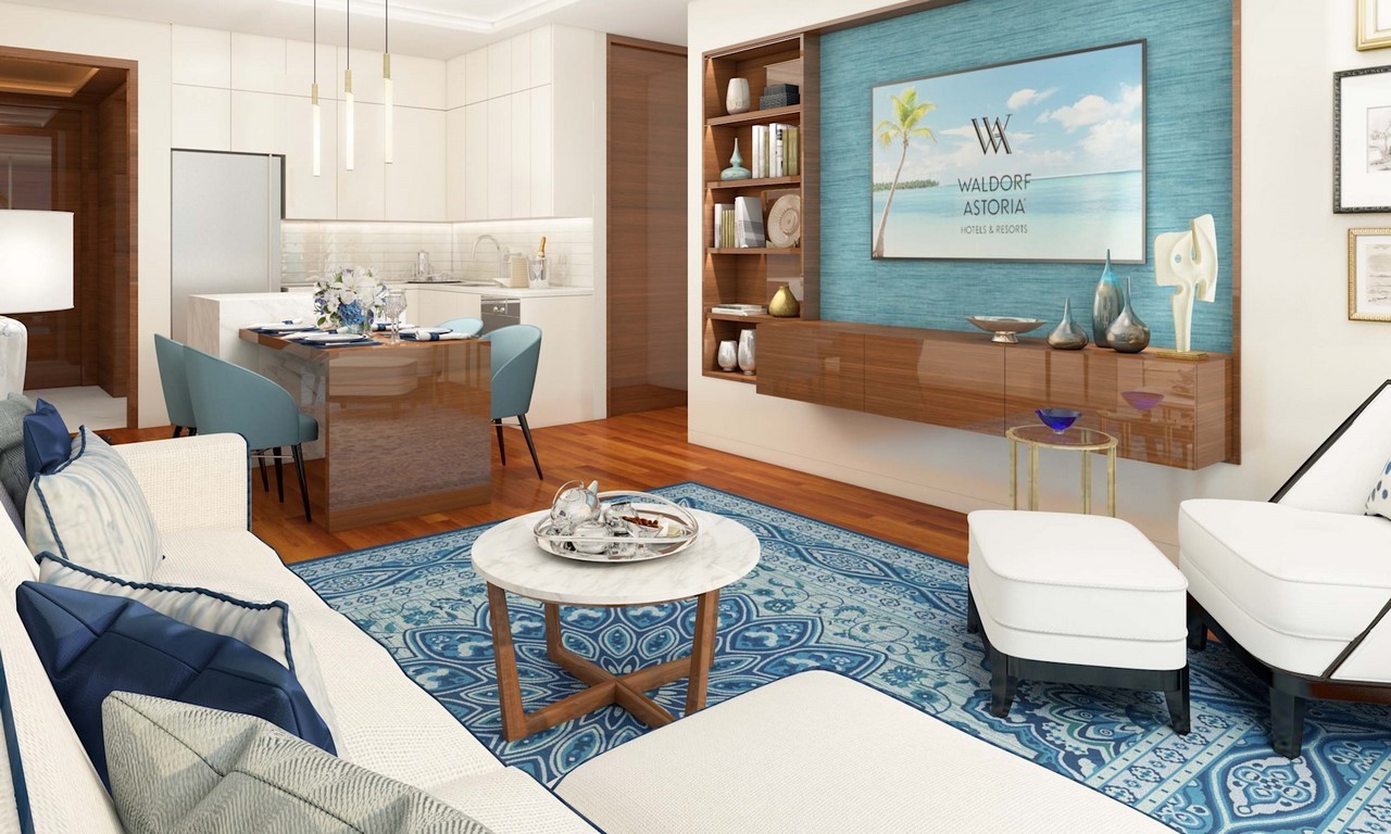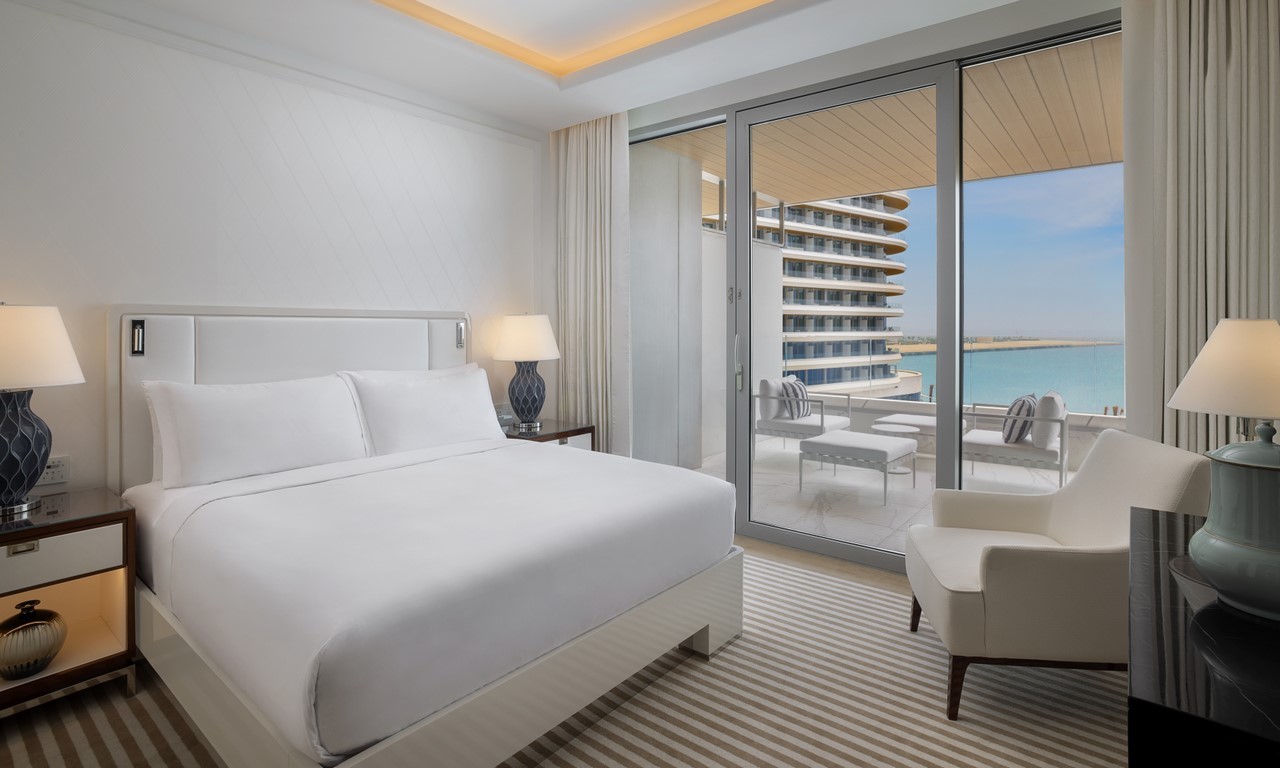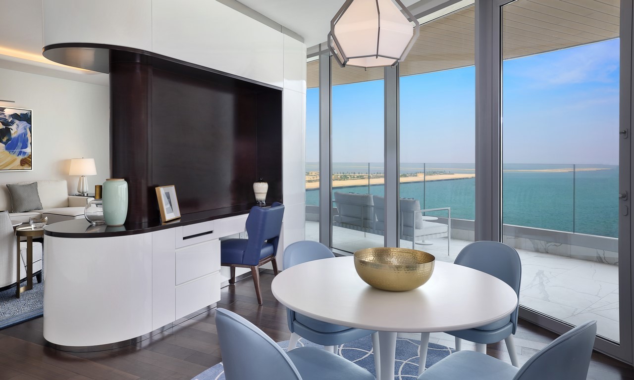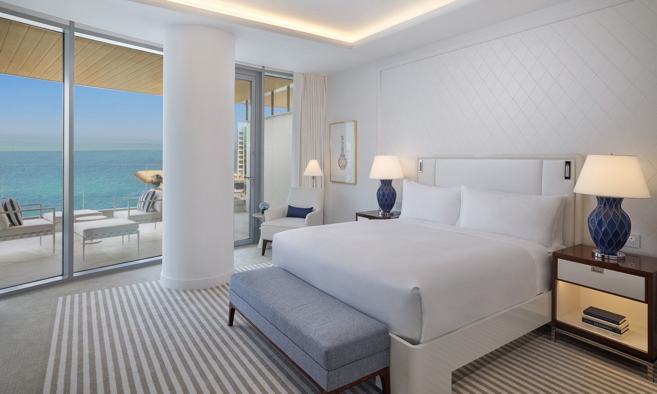 One-bedroom corner suite with sea view: 201 кв. m, спалня, Кинг-размер легло, хол, трапезария, 2 бани, душ и вана, балкон (50 кв. m), гледка към морето.