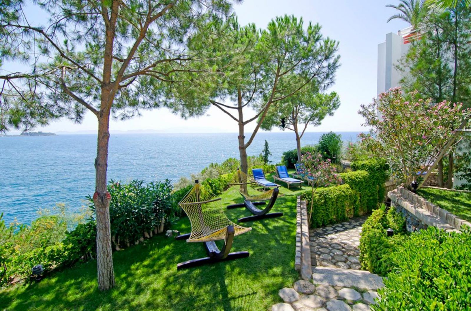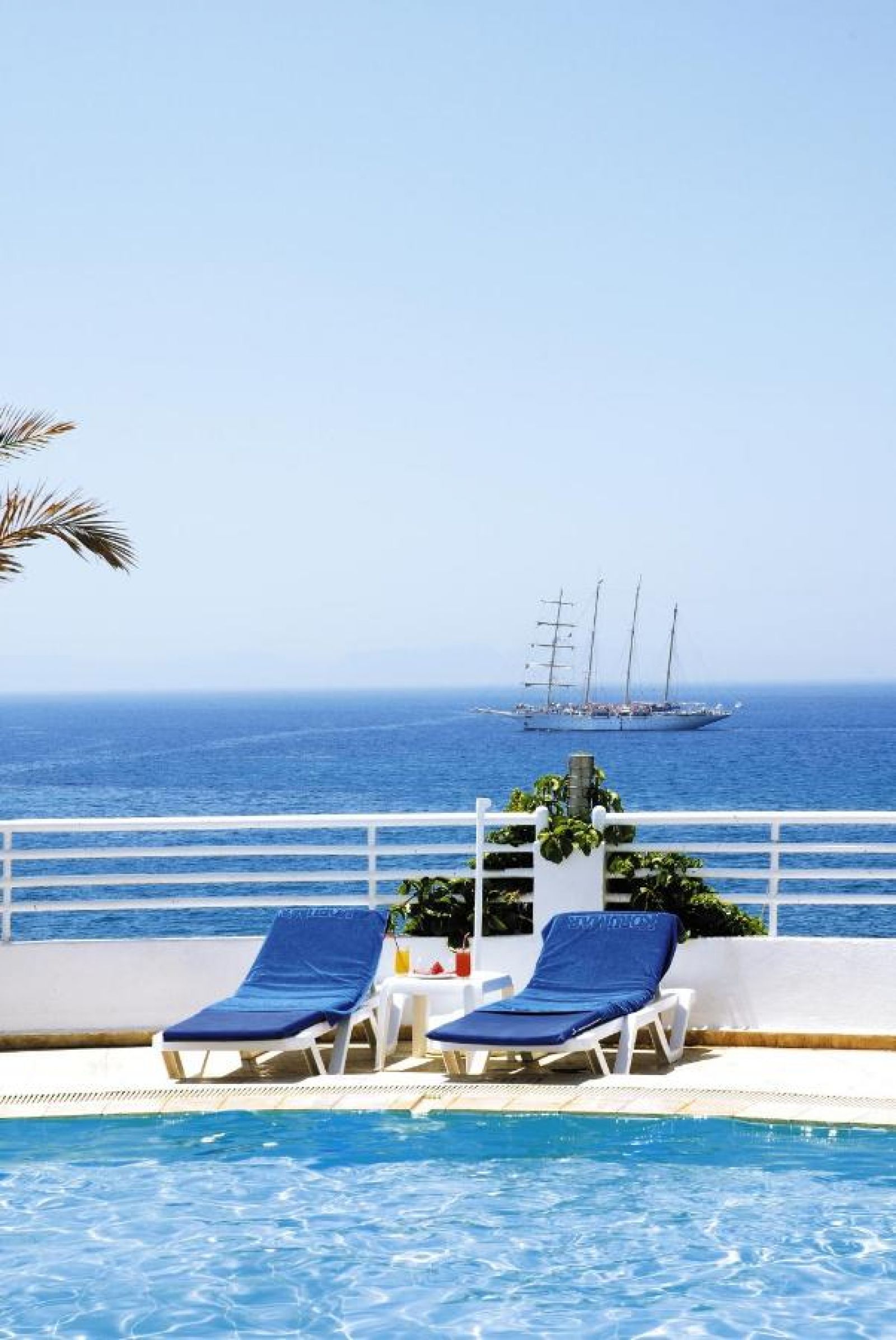 Собствен, пясъчно-чакълест и платформа в малък живописен залив. Достъпът до плажа е по стълби / с асансьор. Чадъри, шезлонги, матраци и кърпи – безплатно.