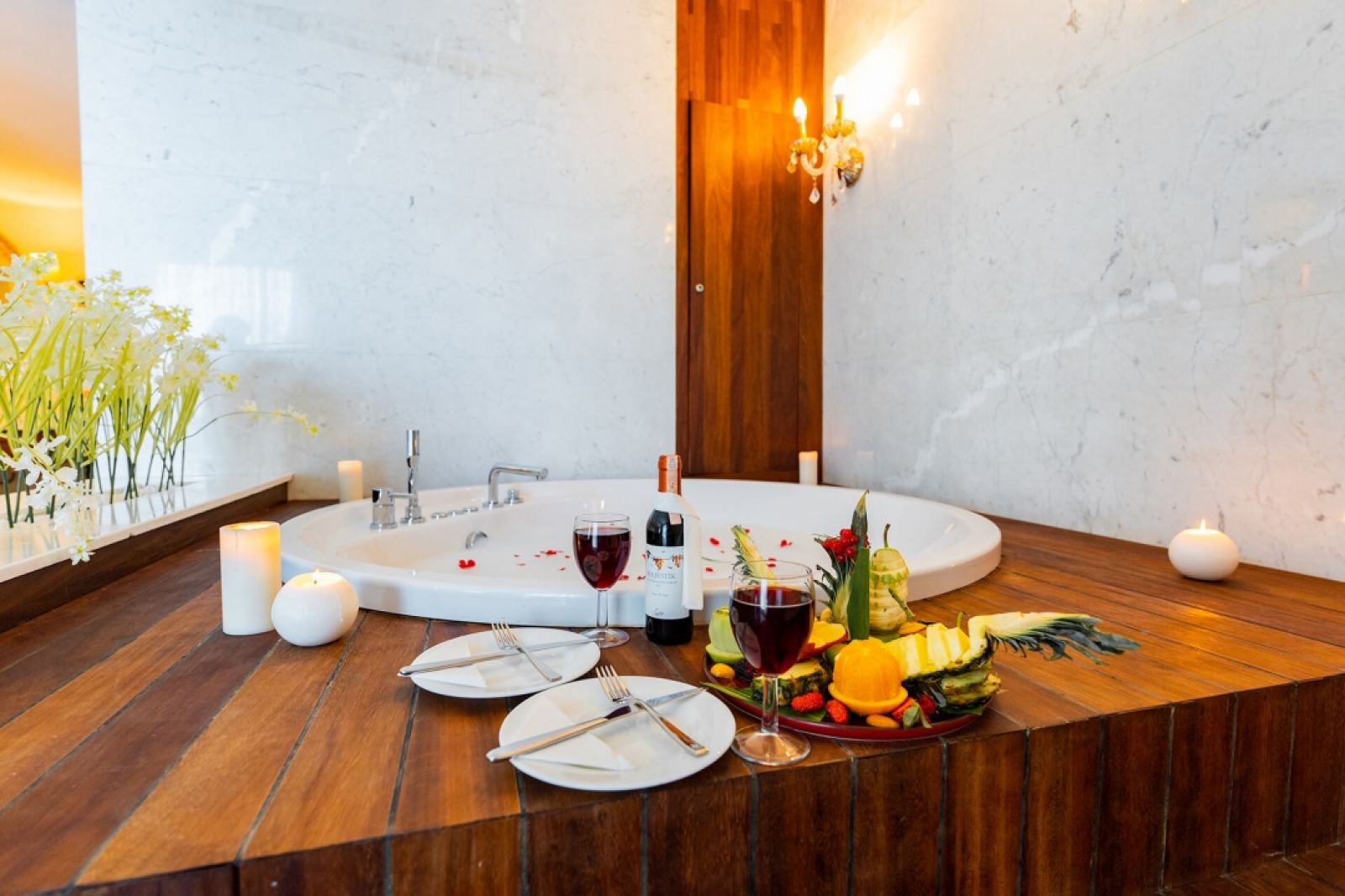 Пакет "Младоженци": Специална декорация на стаята, кошница с плодове и вино в стаята при пристигане, приоритетна резервация за едно посещение в един от а-ла-карт ресторантите (с предварителна резервация).