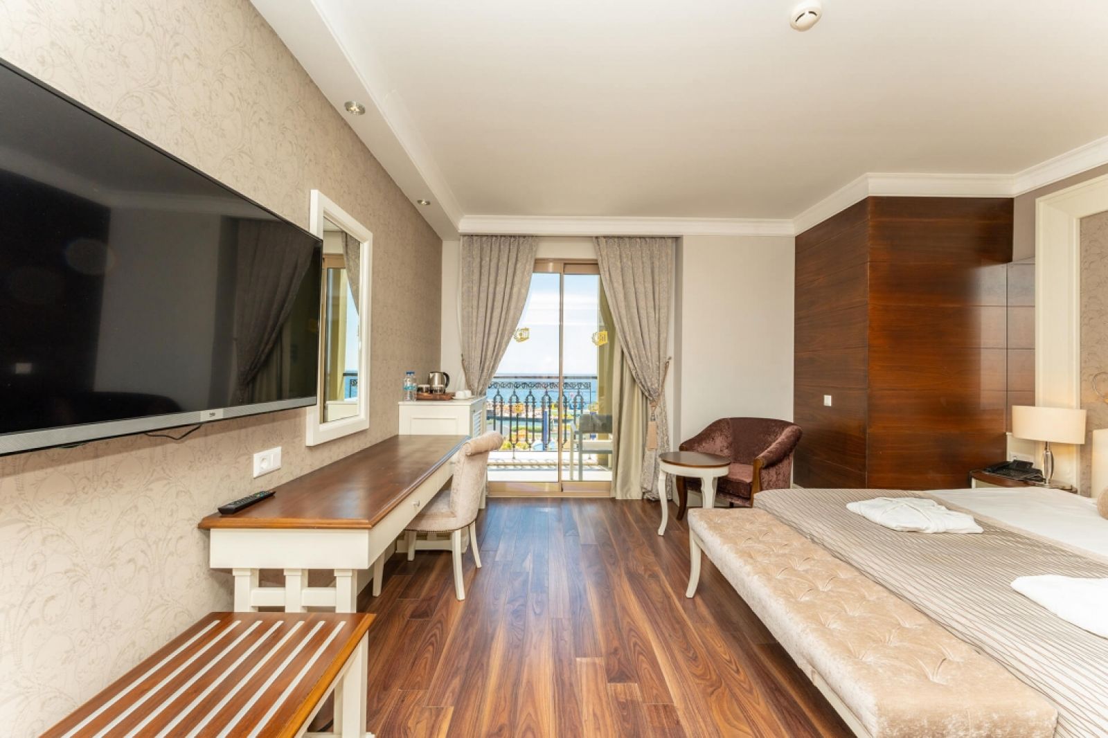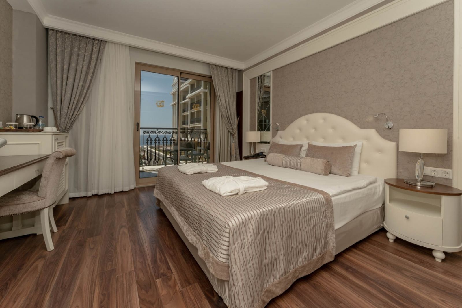 Собствен, пясъчно-чакълест, притежаващ сертификат "Син флаг" и платформа. Чадъри, матраци, шезлонги и плажни кърпи при басейна и на плажа – безплатно.
