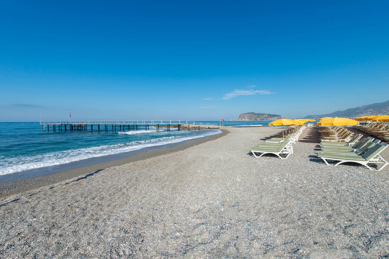 Собствен пясъчно-чакълест, чрез подлез. Плажни кърпи, чадъри, шезлонги на плажа и при басейна - безплатно, на кея - срещу доплащане.