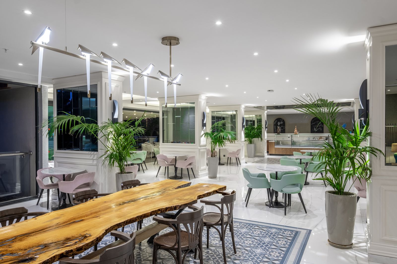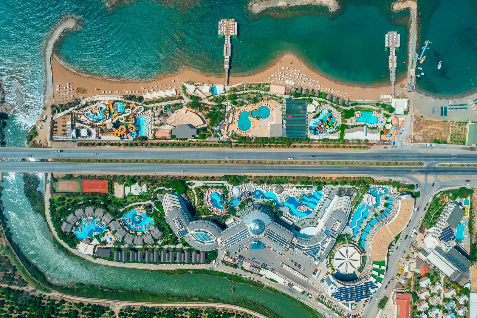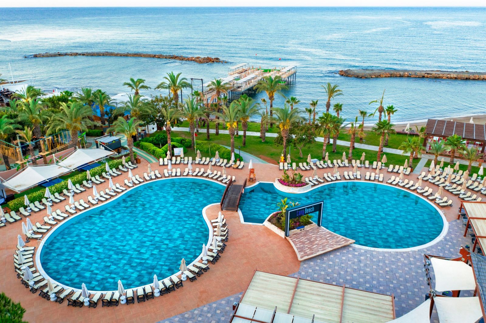 3 основни ресторанта (Villa ресторант - само за гостите, настанени в типове помещения: Villa, Chalet и Swim Up), 5 а-ла-карт ресторанта (турски, италиански, мексикански, азиатски, рибен – срещу заплащане, с предварителна резервация), 6 снек бара, 2 сладкарници, 16 бара (2 от които срещу заплащане – витамин бар и бленд кафе), дискотека, 11 открити басейна, 2 закрити басейна (отопляеми в периода до 15.04 и след 15.10), 6 аквапарка с общо 36 водни пързалки за деца и възрастни, СПА център, магазини, 1 конферентна зали, паркинг.