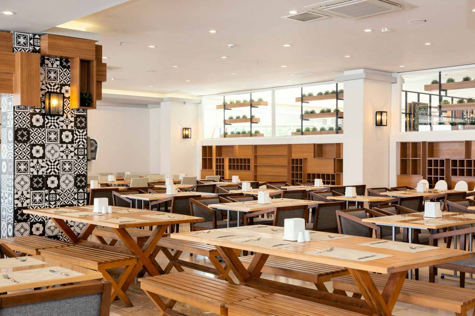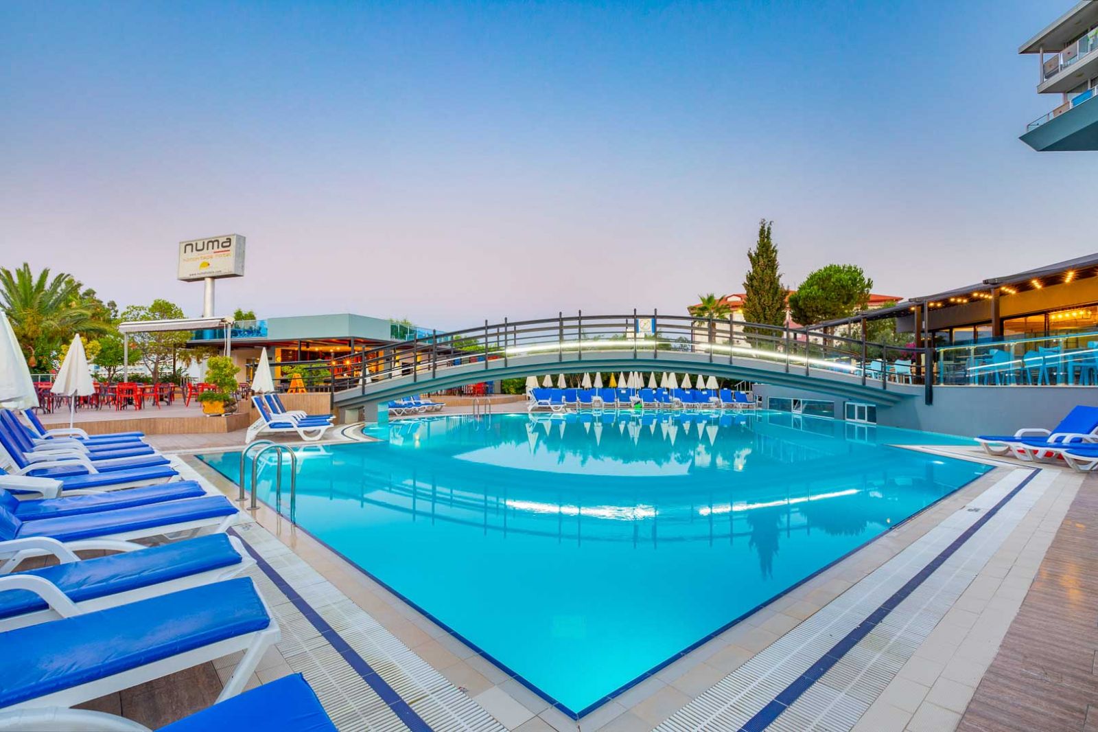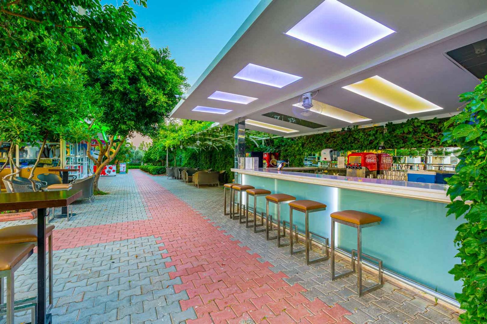 Основен ресторант, 2 снек ресторанта, сладкарница, 4 бара, 4 открити и 1 закрит басейн, 2 водни пързалки за възрастни и 3 за деца, СПА център.