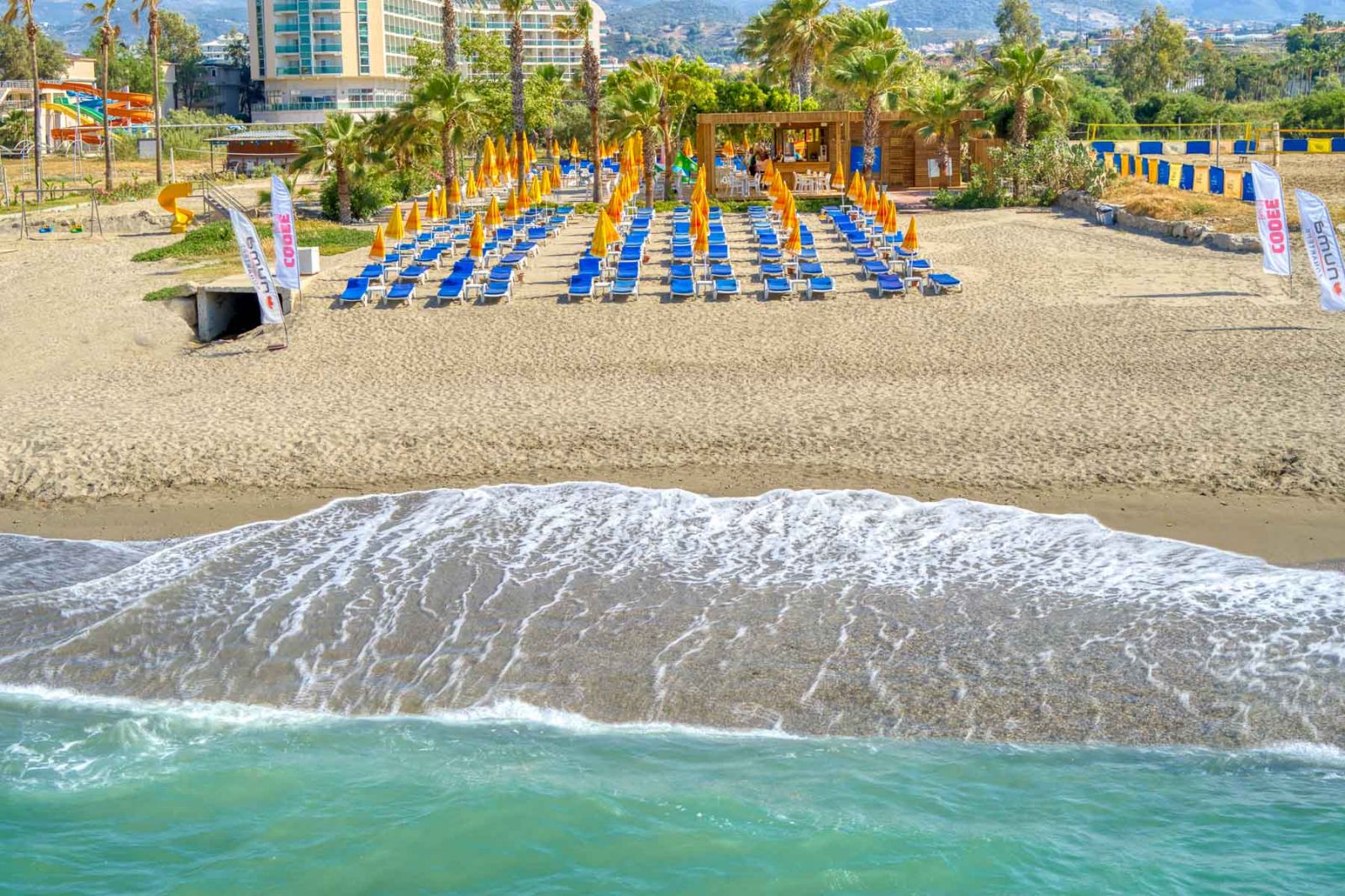 Собствен, на 500 м от хотела, пясъчно - чакълест. До плажа се стига посредством подземен тунел, предлага се и безплатен шатъл бус. Чадъри, шезлонги и плажни кърпи на плажа и при басейна – безплатно.