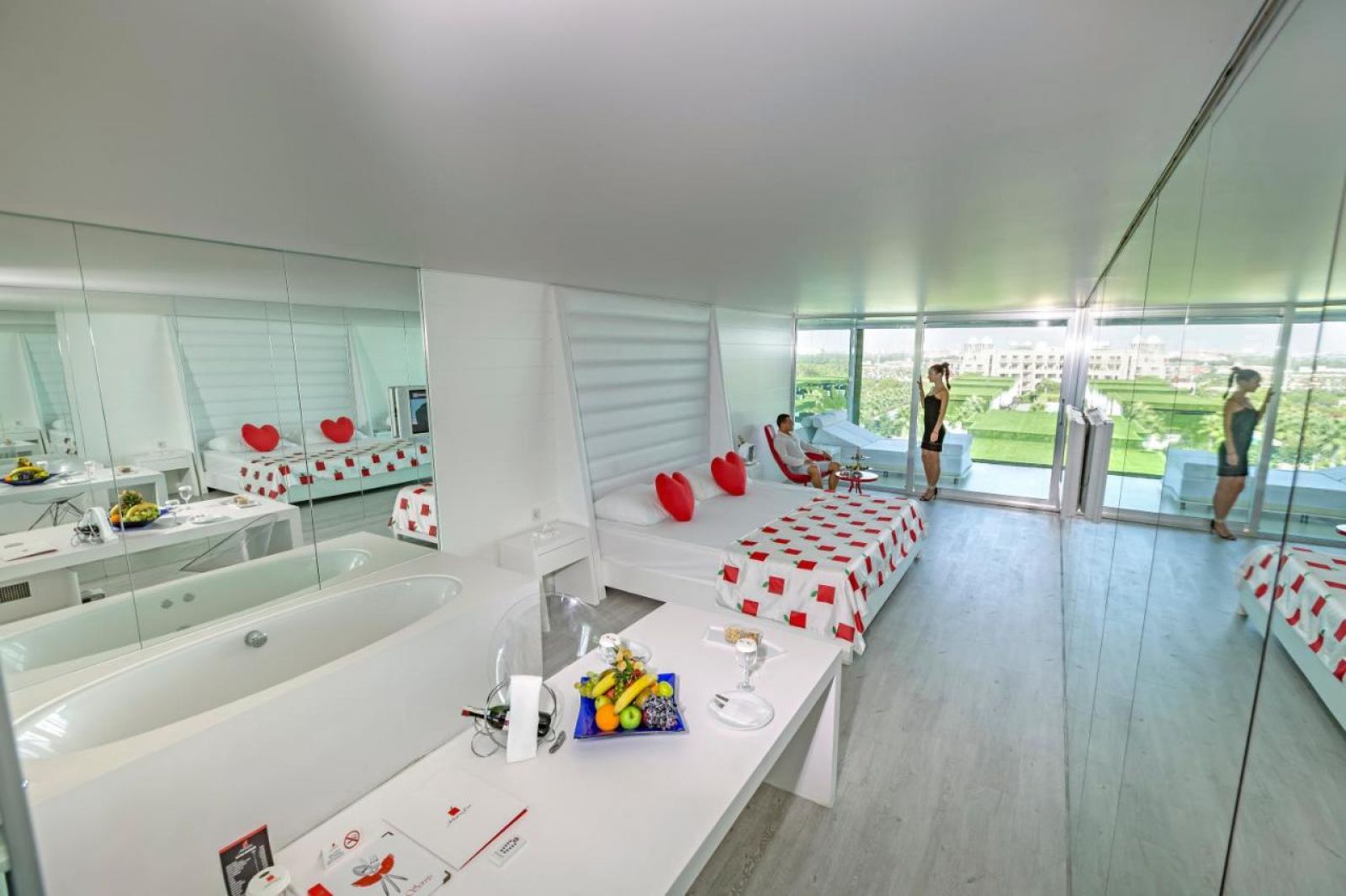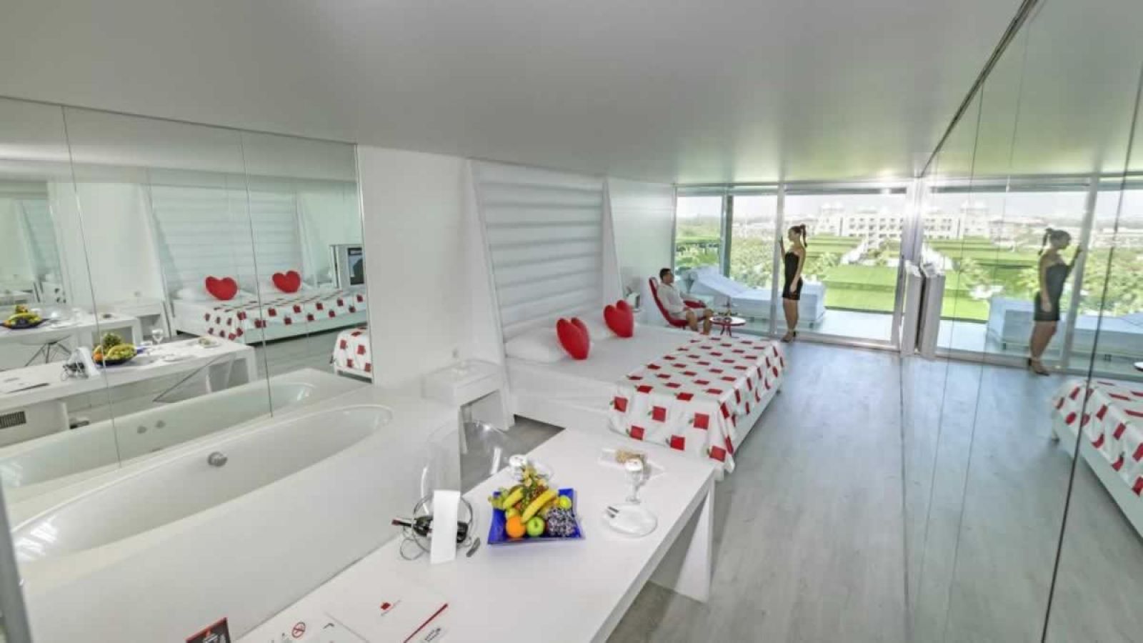 Всички стаи са оборудвани с климатик, телевизор, телефон, баня с душ/вана + парна баня, сешоар, халат (при поискване) и чехли, сет за кафе/чай, минибар (безплатен), сейф (безплатен), макси бар (платен), джакузи (без стаите за инвалиди), дизайнерски мебели, червено осветление, светещо огледало за гримиране, терапевтично легло на терасата.
