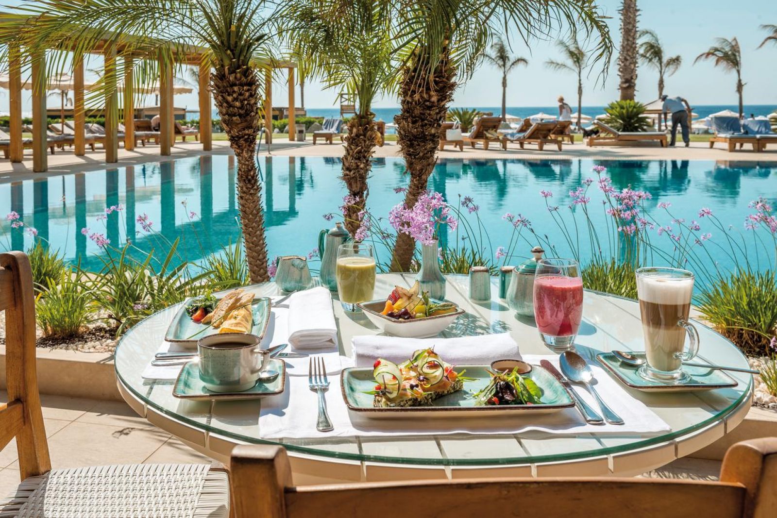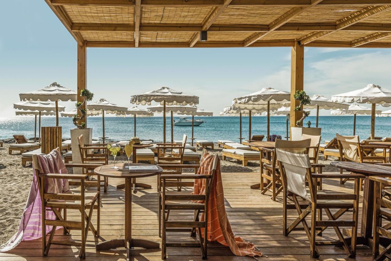 В основния ресторант се сервират закуска, обяд и вечеря. Негов специалитет са гръцките и международни ястия на шведска маса и има открита кухня. На плажа има бар и пещ за пица. На разположение на гостите има целодневен бар, шампанско бар с изглед към Егейско море и винен бар.