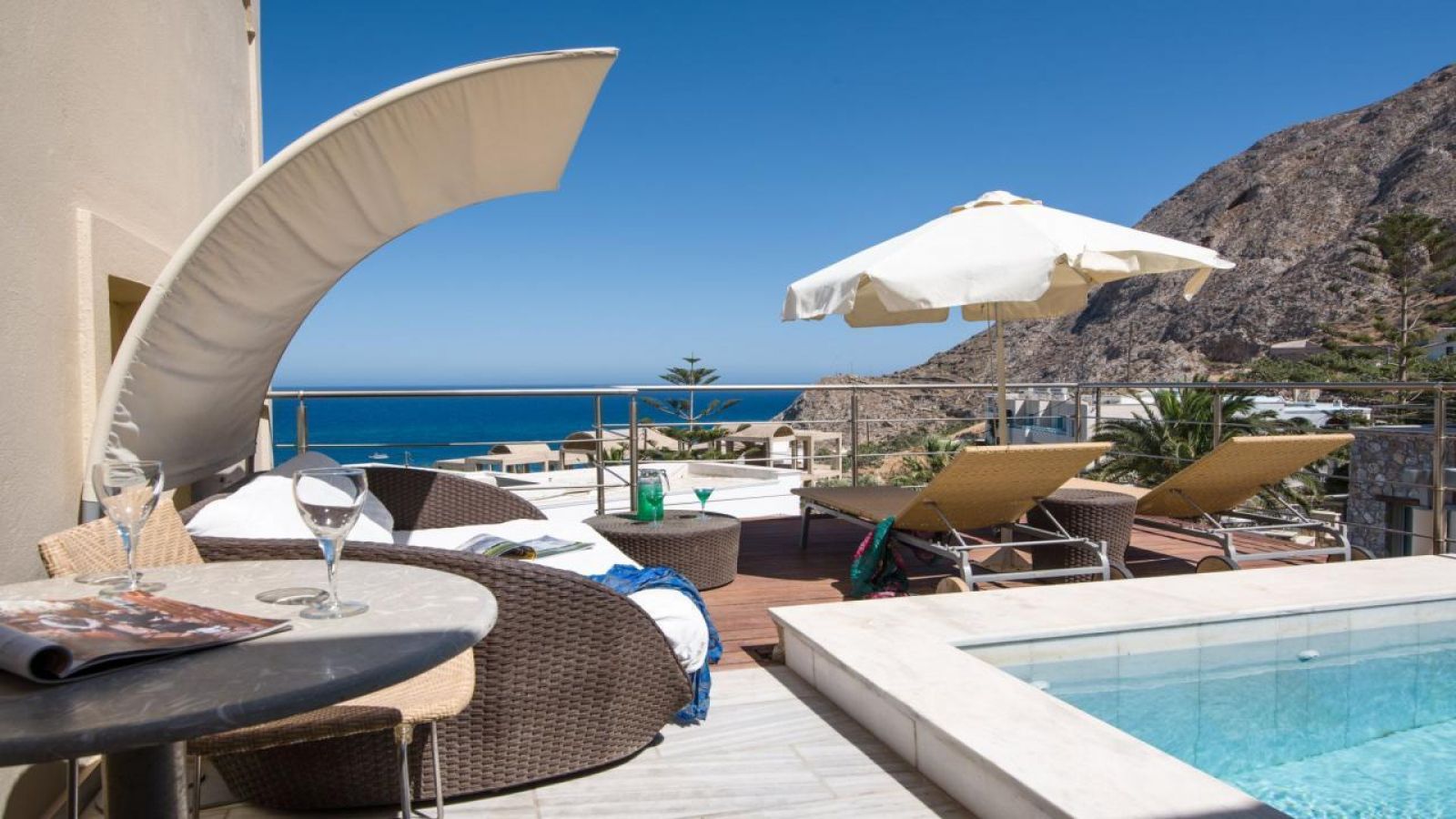В съответствие с отличителната цикладска архитектура и с минимален декор, джуниър суитите разполагат със самостоятелни балкони с невероятна гледка към Егейско море. Освен това стаите предлагат модерни и удобни удобства.